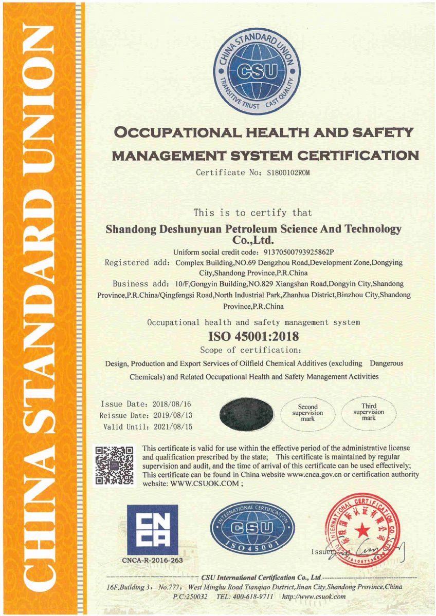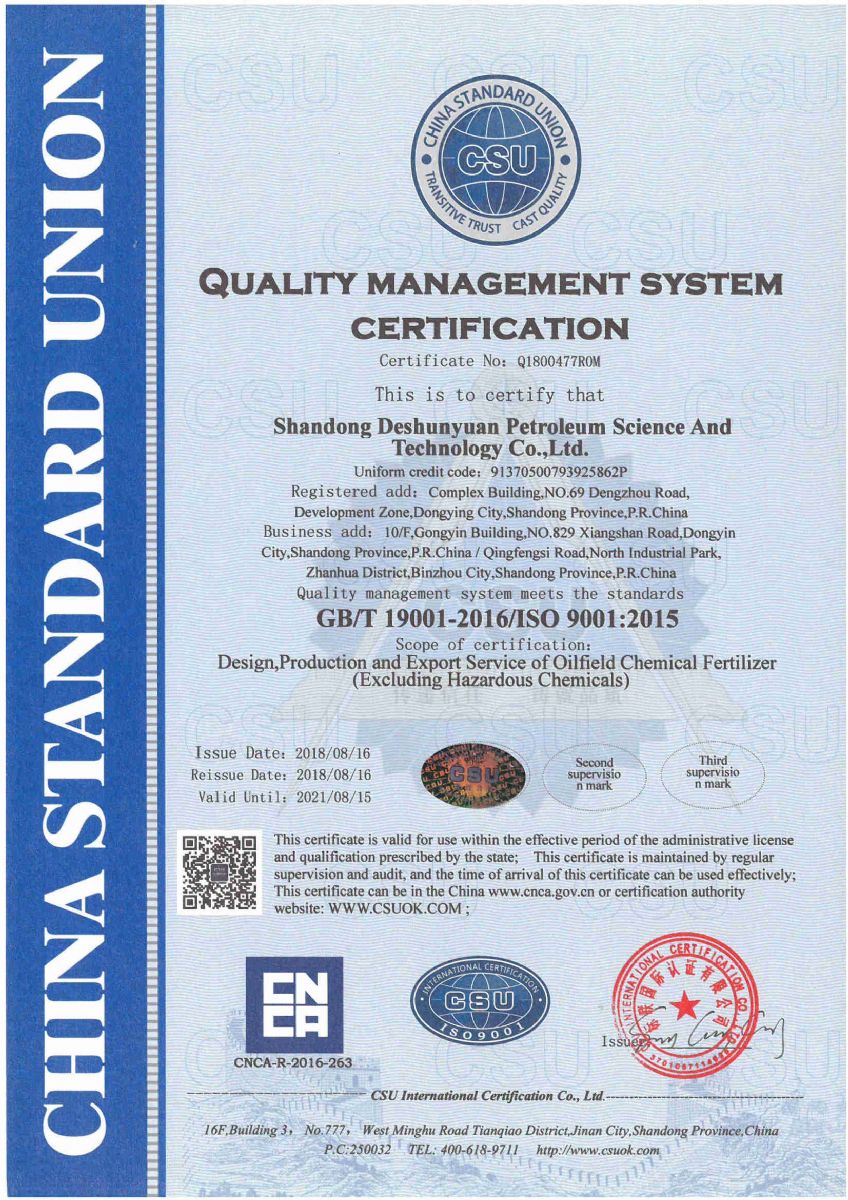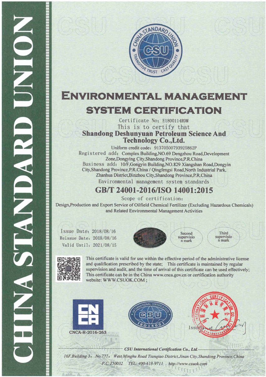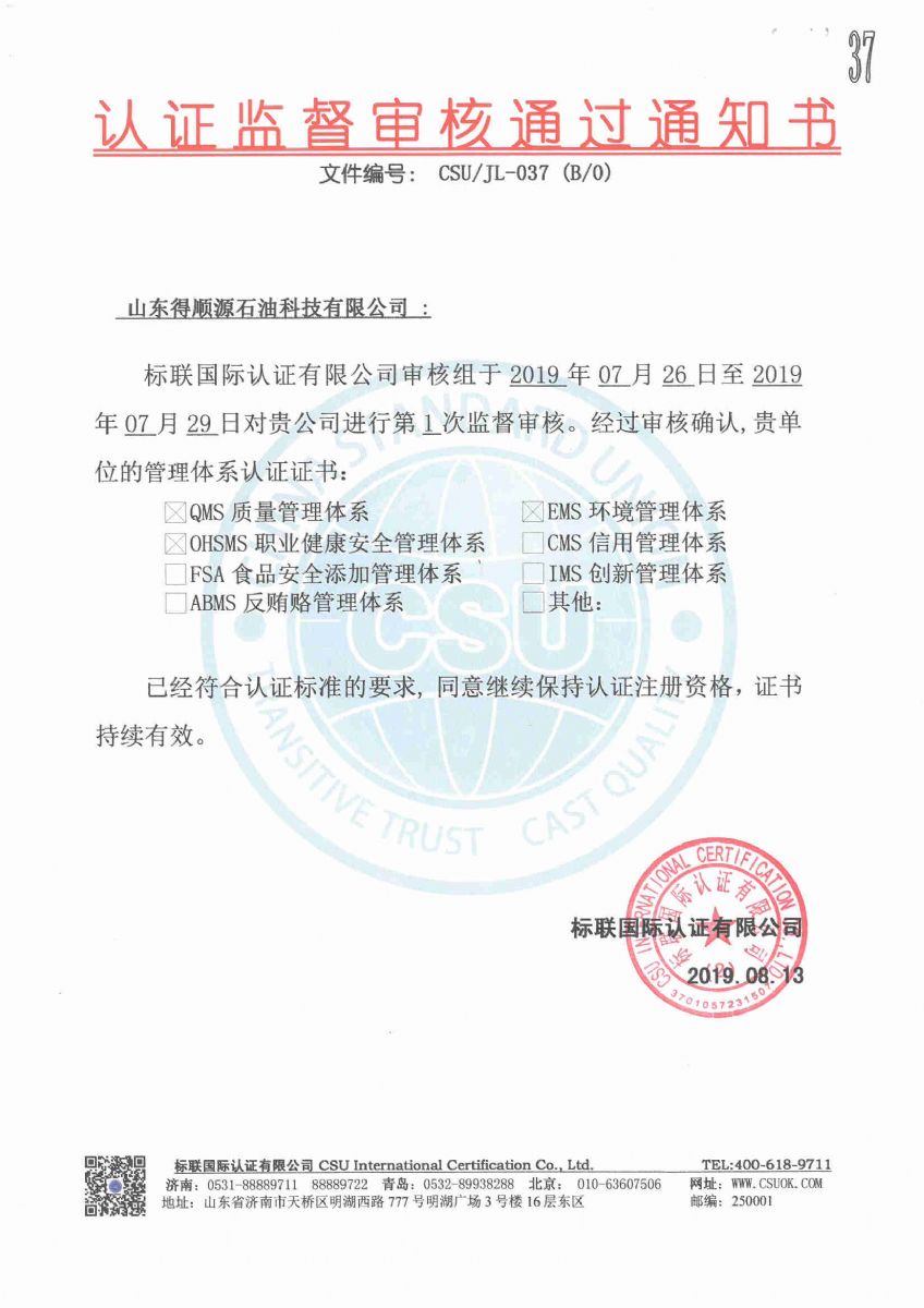 Shandong Deshunyuan Petroleum Sci& Tech. Co., Ltd has successfully passed supervision and audit of the three-system certifications, and continued to maintain the certificates as well
