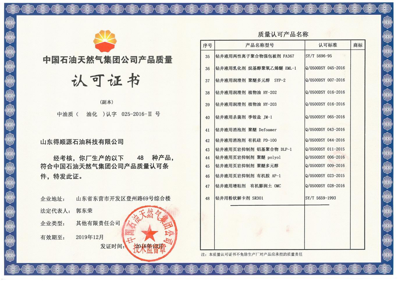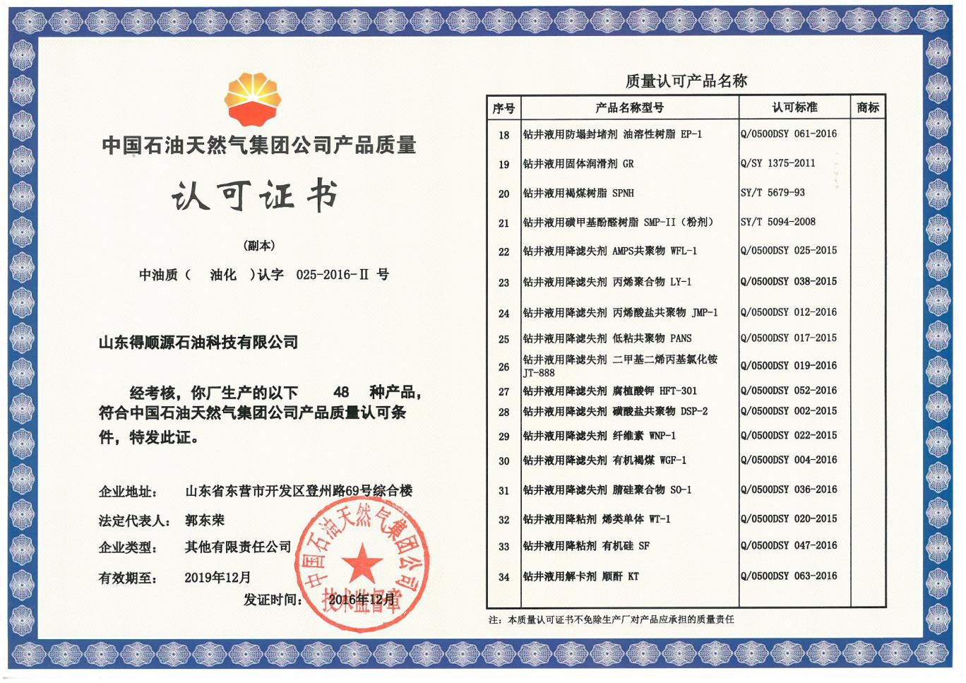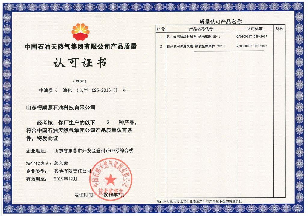2018年公司新研發的兩個產品:(1)鉆井液用防塌封堵劑 納米聚酯NP-1和(2)鉆井液用降濾失劑 磺酸鹽共聚物DSP-1成功增加到中石油產品質量認可證內。截止目前,公司在中石油產品質量認可證范圍內的產品已經增加至50個產品。