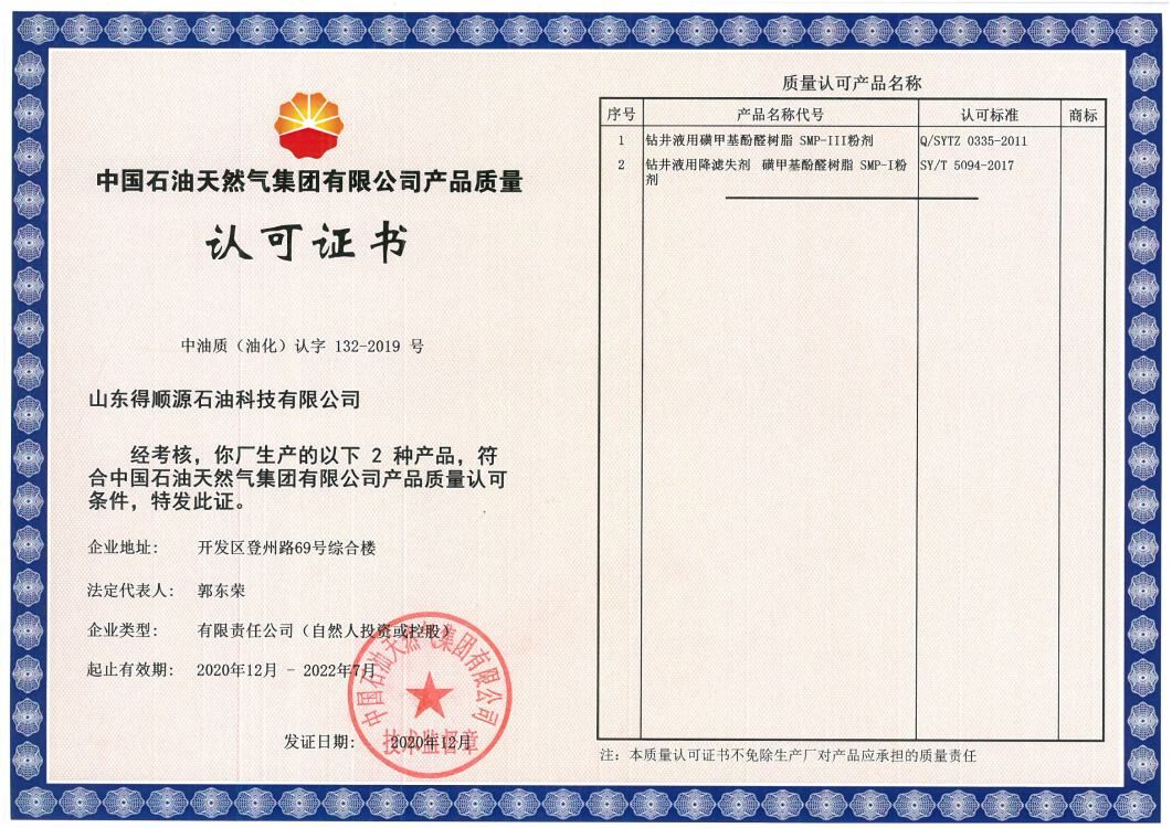 2021年1月27日,公司磺甲基酚醛樹脂SMP-1和SMP-3順利增項到中石油產(chǎn)品質(zhì)量認可證,進一步豐富了中石油產(chǎn)品質(zhì)量認可證的產(chǎn)品體系。至此公司在中石油產(chǎn)品質(zhì)量認可證的產(chǎn)品已經(jīng)增加至49個。