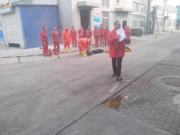 本次演練模擬聚合物工段丙烯酸打料泵損壞,導致丙烯酸泄漏經靜電引發火災事故;現場演練啟動響應環節,公司各級管理人員在收到報警信息后,迅速集結,根據現場火情評估后,應急總指揮臧運福在第一時間啟動了公司聚合物DSP工段火災事故現場處置應急預案,并赴現場指揮。應急隊員分工協作,現場增員全力處置初期火險、封鎖警戒事故現場、清點疏散人員、實施道路交通管制等。經現場確認,火險已撲滅,無人員受傷被困,演練圓滿完成。