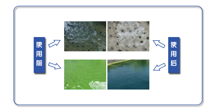 采用沖擊式加藥,投加量一般為100-200mg/L,即對(duì)菌藻類有很好的殺滅效果。藻類較多時(shí)如欲獲得快速剝離效果可適當(dāng)加大用藥量,并及時(shí)清除漂浮物。