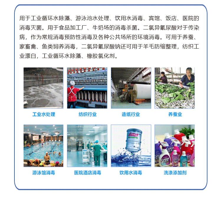 PO-702固體氧化性殺菌劑主要成分二氯異氰尿酸鈉是一種高效、廣譜、新型內(nèi)吸性殺菌劑,有強(qiáng)的殺生作用,在20ppm時,殺菌率達(dá)到99%??蓺绺鞣N細(xì)菌、藻類、真菌和病菌?;瘜W(xué)性質(zhì)穩(wěn)定,干燥條件下保存半年內(nèi)有效氯下降不超過1%便于貯存運輸;使用安全、簡便、用量少、藥效持續(xù)時間長。固體氧化性殺菌劑作用機(jī)理為:噴施在作物表面能慢慢地釋放次氯酸,通過使菌體蛋白質(zhì)變性,改變膜通透性,干擾酶系統(tǒng)生理生化及影響DNA合成等過程,使病原菌迅速死亡。